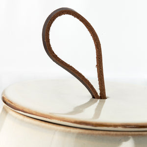 Der Reiz und die Besonderheit der Produkte der Serie Amera besteht darin, dass die Produkte mit einer doppelten reaktiven Glasur beschichtet sind. Dadurch können von Stück zu Stück Abweichungen in Farbe und Aussehen auftreten. Dies macht die Charakteristik und den Charme der Serie aus. HINWEIS: Der Krug ist mikrowellen- und spülmaschinenfest. Allerdings muss das Lederband vor dem Waschen entfernt werden.