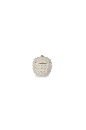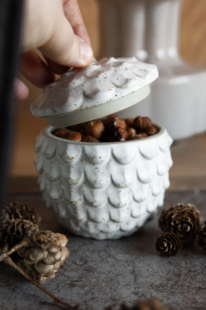 Ein Keramikgefäß in Form eines Tannenzapfens. Ein schönes und funktionales Stück, perfekt zur Aufbewahrung von Leckereien, Snacks oder als dekorativer Akzent.