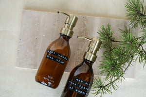 Handcreme, eine wunderbar pflegende Lotion, die auch in Ihrem Zuhause schön aussieht. in der Toilette, im Bad oder in der Küche. Es gibt verschiedene Ausführungen, braunes Glas oder klares Glas, Messingpumpe oder schwarze Pumpe und verschiedene Texte einfach und klar oder witzig. Das Produkt ist nicht nur gut für die Haut, sondern auch für Ihre Umwelt.