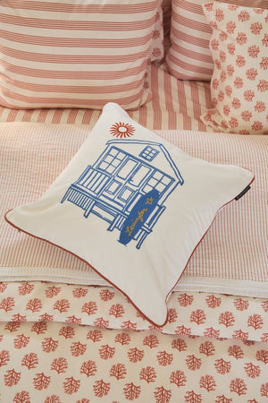 Verleihen Sie Ihrem Zuhause mit diesem Kissenbezug aus bedruckter Bio-Baumwolle mit Strandhaus-Print eine maritime Note. Farblich abgestimmte Paspeln und ein farblich passender Reißverschluss verbinden Funktionalität mit Stil. Der Bezug aus der Sommerkollektion ist Oeko-Tex-zertifiziert und wird in einer Fabrik mit Umweltzertifizierung hergestellt. Das gewebte Lexington-Logo verleiht dem Bezug einen edle Optik.