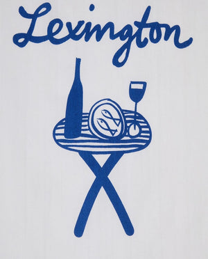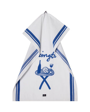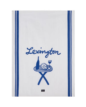 Dieses weiche und funktionelle Geschirrtuch aus 100 % Bio-Baumwollköper in Weiß ist mit einem exklusiven blauen „Table“-Print verziert. Es ist nachhaltig und Oeko-Tex-zertifiziert und wird in einer Fabrik mit Umweltzertifizierung mit einem Aufhänger mit Lexington-Logo und einem gewebten Etikett hergestellt. Perfekt für jede Küche.