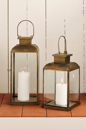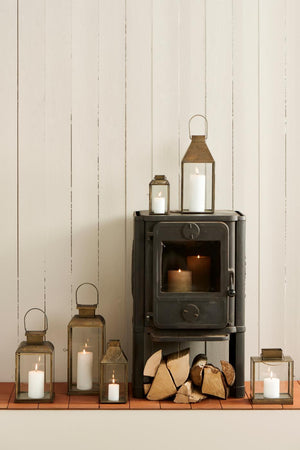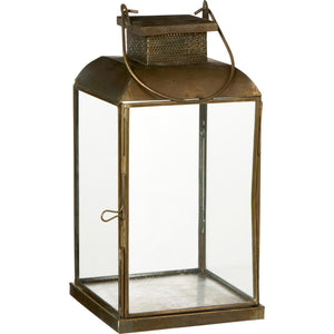 Die David-Laterne ist aus dunklem Metall gefertigt und mit Seiten aus klarem Glas sowie einem dekorativen Lochmuster oben versehen. Die quadratische Form und die glatte Metalloberfläche verleihen der Laterne einen minimalistischen und klassischen Ausdruck.