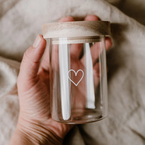 Entdecke die wunderschönen und praktischen Mini Vorratsgläser Herz weiss aus Borosilikatglas mit Akazienholz Deckel von Eulenschnitt