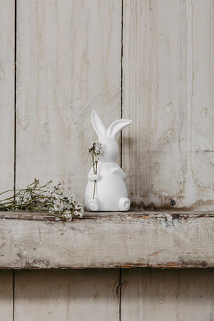 Dekoration aus Keramik. Emilia ist ein niedliches Häschen, das gut zu den anderen Osterdekorationen der Kollektion passt. Emilia kann mit einer Feder oder einer Blume dekoriert werden, die in ihrer Hand platziert werden kann.