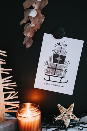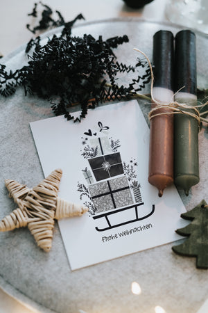 Unsere weihnachtliche Postkarte mit dem schlichten und zeitlosen Spruch "Frohe Weihnachten", kombiniert mit einem Schlitten voller Geschenk, bringt die festliche Botschaft direkt auf den Punkt. Diese Karte ist perfekt, um deinen Liebsten herzliche Weihnachtsgrüße zu senden.