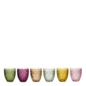 Tischlein deckt dich mit einem Regenbogen von wunderschönen Gläsern oder decke diese nach Belieben. Die Gläser von Chic Antique sind mit schönen Mustern geprägt – perfekt, um ein lebhaftes uns sommerliches Ambiente zu schaffen.