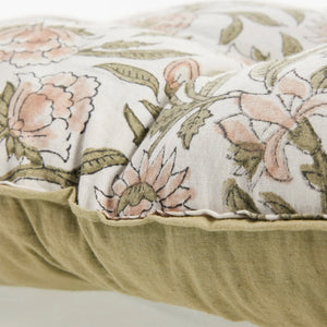 Verwandeln Sie Ihren Raum mit diesem wunderschönen Kissen in eine Wohlfühloase. Eine Seite zeigt ein handgedrucktes Blockmuster, das die Kunstfertigkeit des Handwerks widerspiegelt und sicherstellt, dass jedes Stück ein echtes Unikat ist. Die Rückseite bietet eine passende einfarbige Gestaltung.
