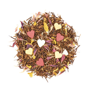 Rooibos (geschützte Ursprungsbezeichnung), weiße Schokoladenherzen (Zucker, Kakaobutter, VOLLMILCHPULVER, Emulgator: Sonnenblumen-Lecithin), Zuckerherzen (Zucker, Reismehl, pflanzliche Öle und Fette (Raps, Raps (ganz gehärtet)), Kartoffelstärke, Farbstoff: E120, E160a, Aroma), Aroma, Kornblumenblüten, Sonnenblumenblüten, natürliches Aroma.