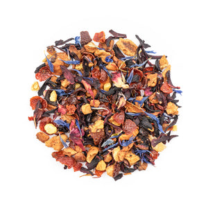 Apfelstücke, Hibiskusblüten, Hagebuttenschalen, Orangenschalen, Kokosraspeln, MANDELSTÜCKE, Ananaswürfel (Ananas, Zucker), Aroma, Färberdisteln, Kornblumenblüten.