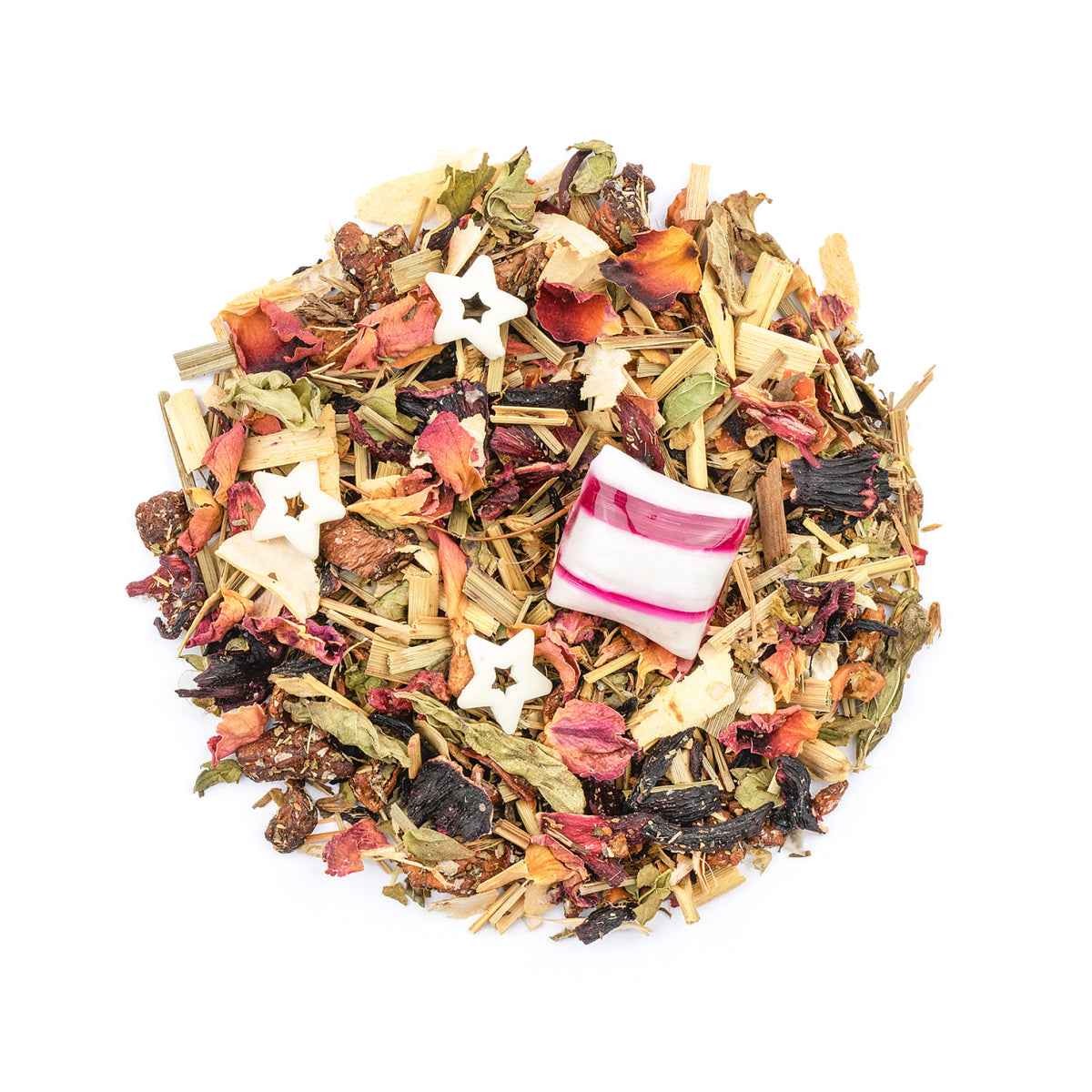 Apfelstücke (Apfel, Säuerungsmittel: Zitronensäure), Pfefferminzbonbons (Zucker, Glukosesirup, Pfefferminzöl, Menthol, Rote Beetesaftkonzentrat) (13%), Hibiskusblüten, Aroma, Lemongras, Bohnenschalen, weiße Zuckersterne (Zucker, Reismehl, Kakaobutter, Kartoffelstärke), Karottenstücke, Nanaminze (3%), Süßkraut, Rosenblütenblätter, Himbeerstücke.